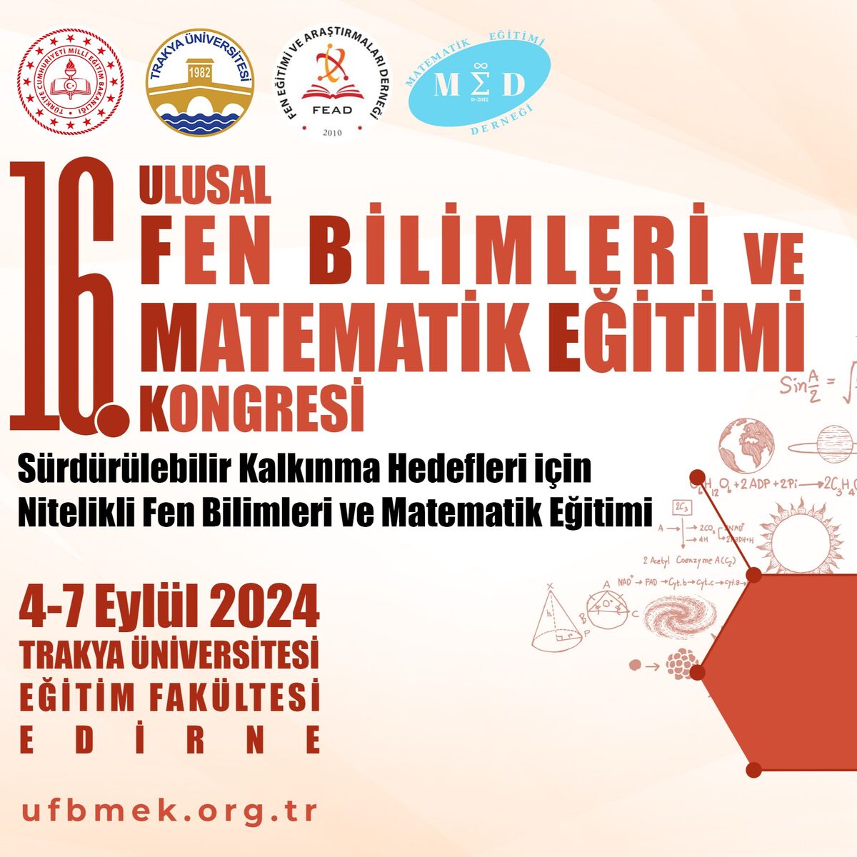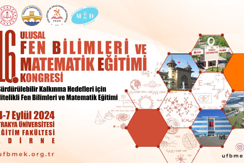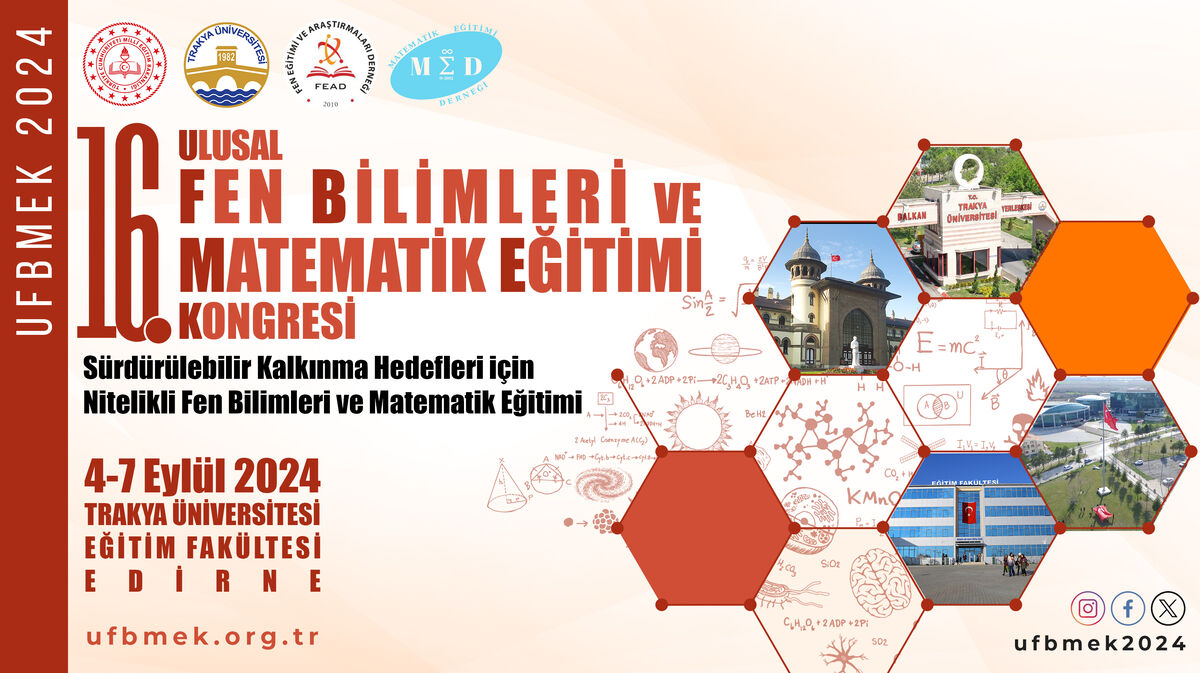16. Ulusal Fen Bilimleri ve Matematik Eğitimi Kongresi (UFBMEK2024) Trakya Üniversitesi Eğitim Fakültesi Matematik ve Fen Bilimleri Eğitimi Bölümü’nün organizasyonuyla; Trakya Üniversitesi, Millî Eğitim Bakanlığı, Fen Eğitimi ve Araştırmaları Derneği ve Matematik Eğitimi Derneği işbirliği ile 04-07 Eylül 2024 tarihleri arasında Edirne’de düzenlenecektir.